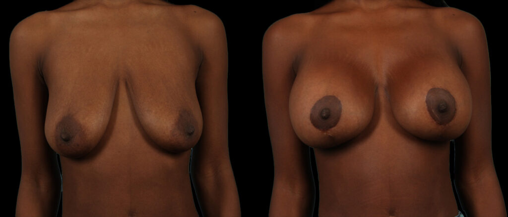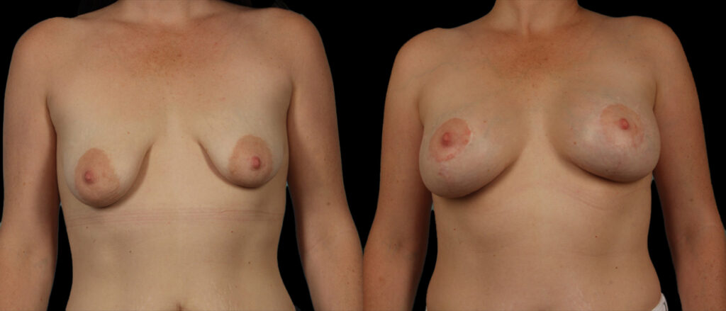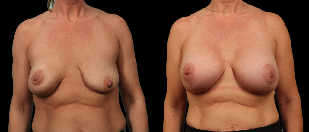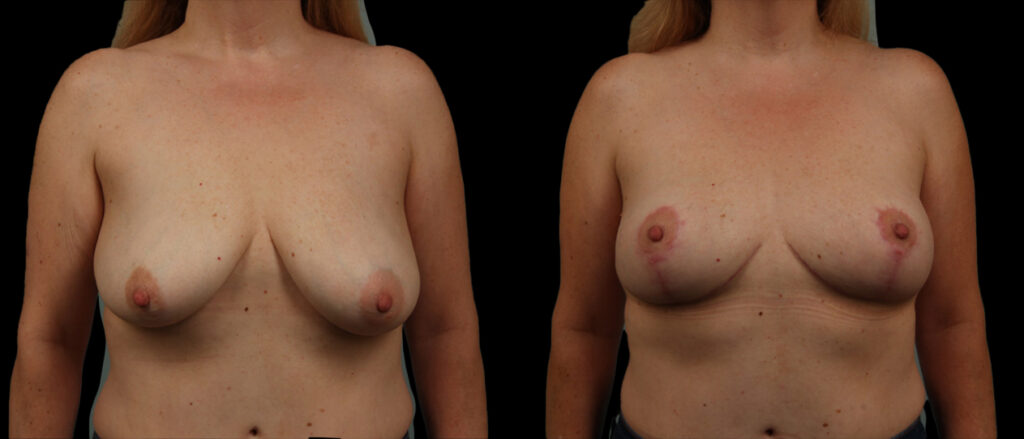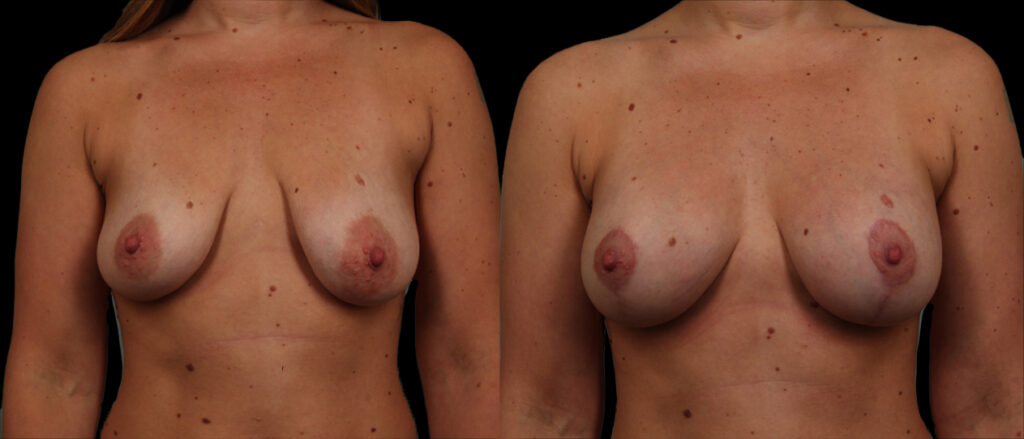 She had 46g of breast skin and tissue removed from her right breast and 85g removed on the left (from the mastopexy). So between that and the implant difference, it evened out her asymmetry.