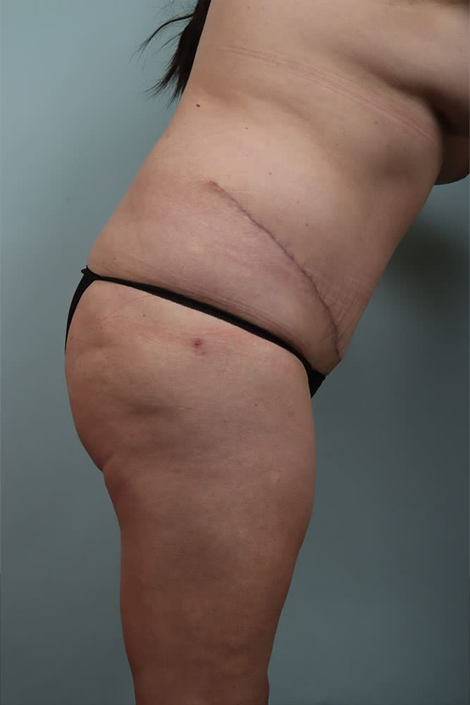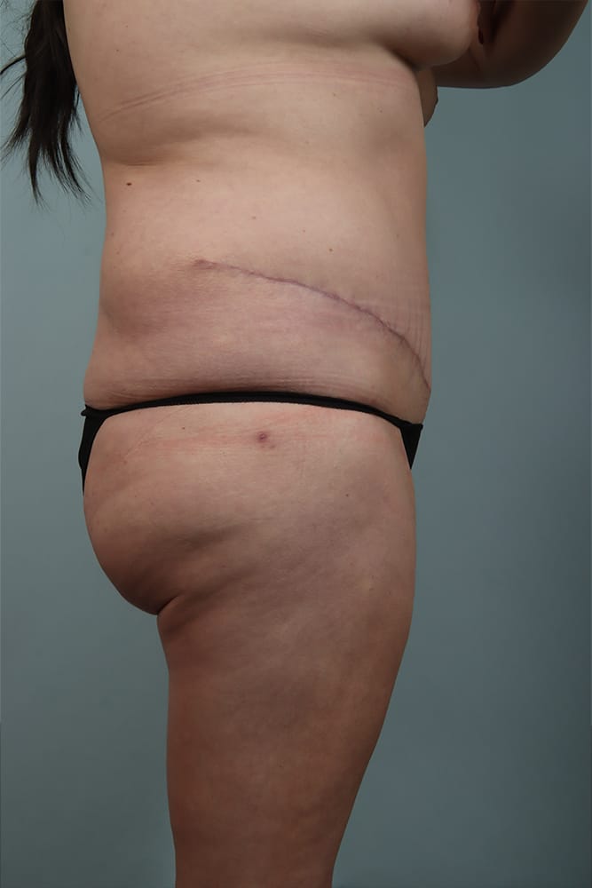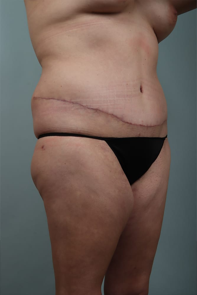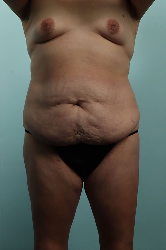 Before and 6 weeks after abdominoplasty with muscle plication, and bilateral breast augmentation using silicone filled implants.